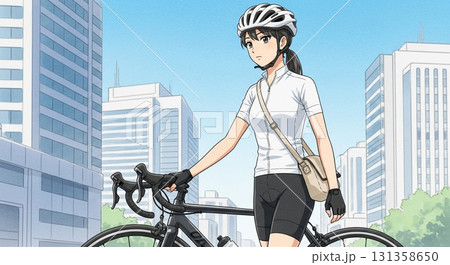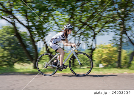 夕焼けに染まるサイクルウェアの女性ロードレーサー