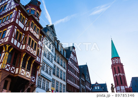 ドイツ フランクフルト・アム・マインのアルトシュタットのレーマー広場の街並みと旧ニコライ教会