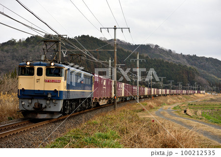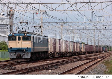 「埼玉県」夕日を浴びて見沼田んぼを疾走するコンテナ貨物列車「EF652127」 武蔵野線