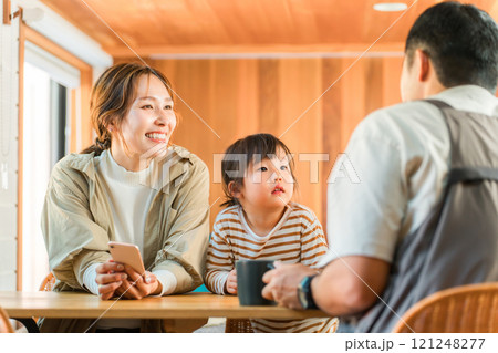 コテージ・バンガローのアウトドアリビングで過ごすファミリー