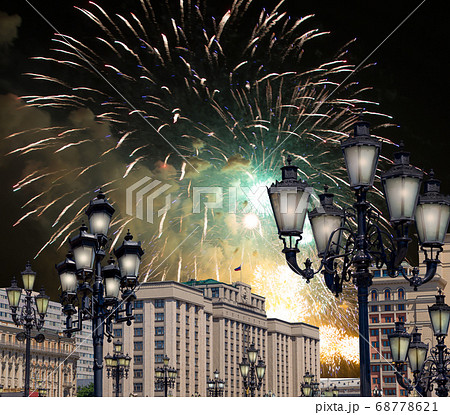 Fireworks over the building of the State Duma of the Federal Assembly of Russian Federation during Victory Day (WWII), Moscow, Russia