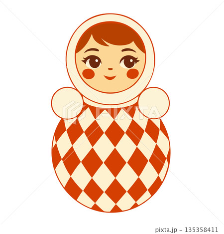 Cute roly-poly doll inspired by Russian folk toy in vintage circus style. Flat vector illustration with harlequin pattern, warm red palette and friendly character. Perfect for children designs