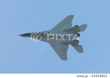 Russian military fighter jet MIG -35 flying over clouds. Air force.