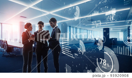 オフィスで会議するグループとデータ統計
