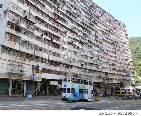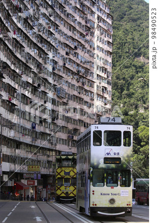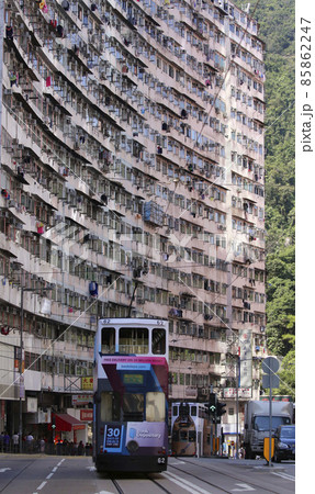 香港・クアリーベイのモンスターマンションの前を走るトラム。英国植民地時代から走る
