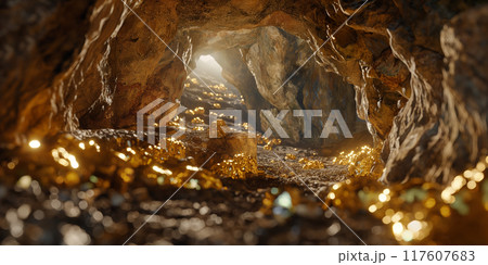 Golden Treasure Hidden Inside a Glowing Cave with Sunlight Streaming Through, AI-generated item