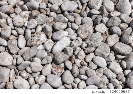 A detailed view of numerous smooth, rounded stones varying in sizes