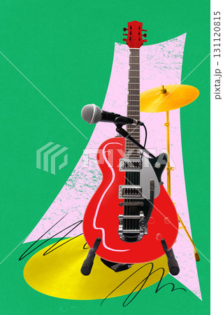 Red electric guitar microphone cymbal collage on green and pink abstract background