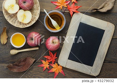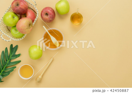 Rosh hashana, Jewish New Year greeting card, invitation. Food styled stock composition with honey