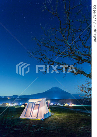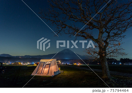 満天の星ふもとっぱらキャンプ場ランタンに光るロッジ型テント、スプリングバーテント、カーカムスと富士山