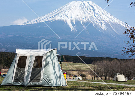 ふもとっぱらキャンプ場のロッジ型テント(スプリングバーテント、カーカムス)と広大な富士山(横構図)