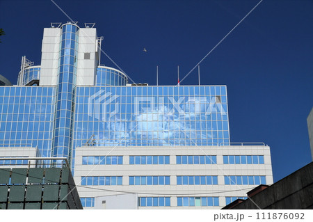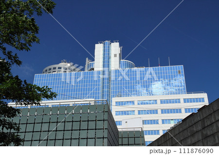 西ヨーロッパのオランダ 南ホラント州の中心都市ロッテルダムのビルの窓に映る青空と雲