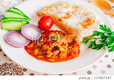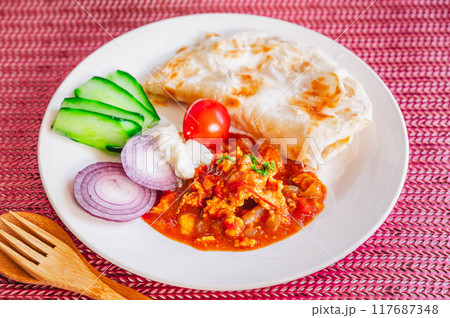 Warm and Appetizing Roti Flatbread Dish with Curry, Traditional Indian Cuisine