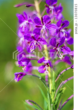 Blooming fireweed vibrant pink flowers reaching for the sun in a lush green habitat during late spring season