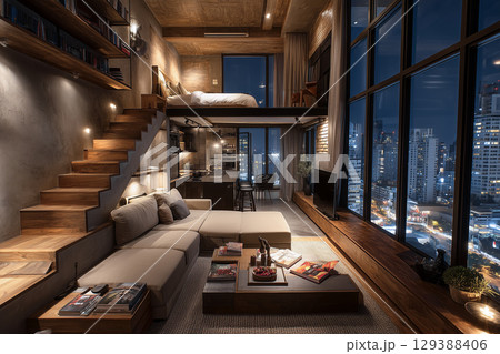 夜景が見えるロフトのある高級マンションのリビング。木目と間接照明が美しいモダンインテリア