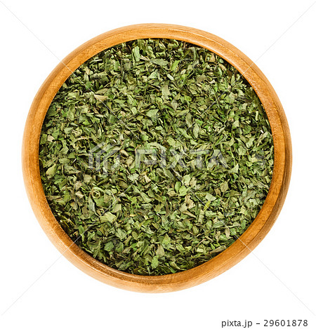Dried and grated lovage leaves in wooden bowl