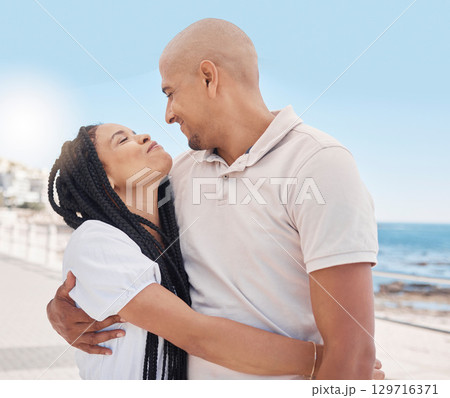 Love, summer and couple hug at the beach enjoying honeymoon, vacation and holiday together. Travel, nature and man and woman embrace, kiss and hugging by ocean for romance, happiness and affection
