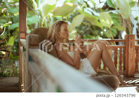 Young woman sit on open-air veranda of wooden bungalow with tropical garden view. Girl relaxing in luxury villa on family summer vacation. Countryside lifestyle.