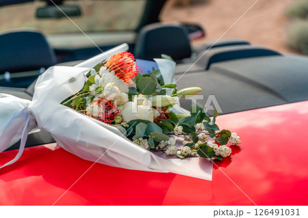 A bouquet of flowers is sitting on the hood of a red car. The flowers are white and red, and they are arranged in a vase. Concept of romance and love.