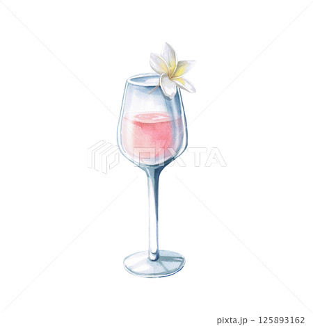 Glass of rose wine with delicate plumeria flower on the rim. Isolated watercolor illustration for restaurant menu design, interior decoration, weddings, poster printing.