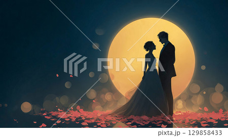 Romantic silhouette of couple under full moon with rose petals, elegant love illustration