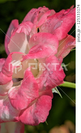 A beautiful pink and white rose, covered in glistening dewdrops, captures a moment of floral elegance