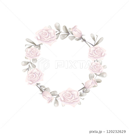 Wreath with Roses and Buds Flowers Pink, Silver Branches with Leaves, Watercolor Digital Illustration Copy Space with Empty Space for Lettering, Print and Web High Quality