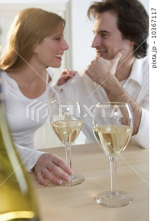 Laughing couple with white wine