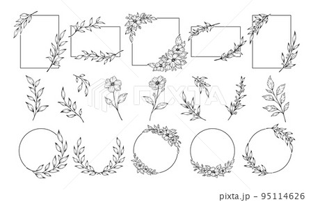 植物のイラスト素材, 装飾フレームのセット, 黒色の線画. 花と葉のラインアート.