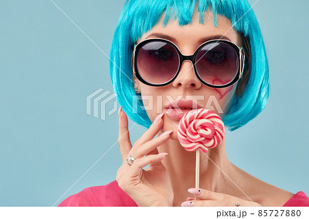 Young funky girl in blue wig and eyeglasses, holding lollipop candy, looking aside with dreamful smile as if making plans for party, isolated on blue background