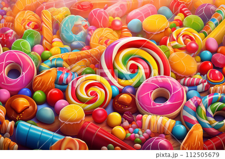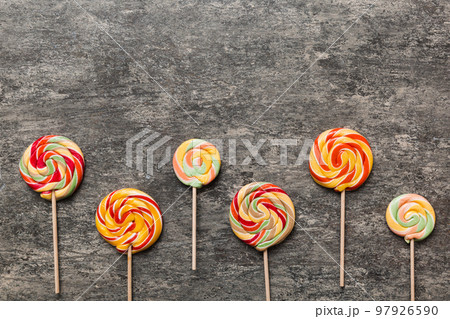Colorful candies, lollypop on the colorful background, multicolored minimal style top view