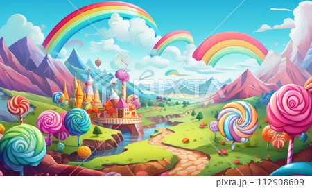 Enchanted Candy Castle with Rainbow Arch and Lollipop Gardens in a Magical Land, Generative AI