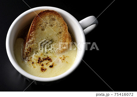 カップで食べるオニオングラタンスープを黒背景で撮影(俯瞰)
