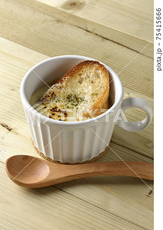 カップで食べるオニオングラタンスープを白背景で撮影(俯瞰)