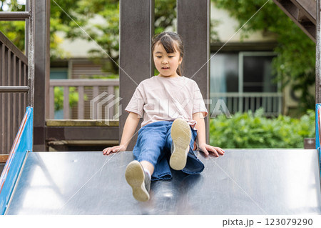 公園のすべり台で遊ぶ日本の男の子(三才児)