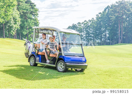 ゴルフ場でゴルフカートに乗るゴルファーの男女