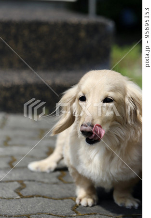 ヨダレを垂らしているシニアのミニチュアダックス クリームダックス