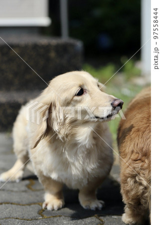 庭を散歩している2匹のミニチュアダックス クリームダックス