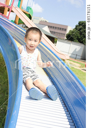 公園のすべり台で遊ぶ日本の男の子(三才児)