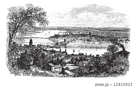 Beautifull aerial view to the Sumy and lake Cheha. Water landscape with city in cloudy day with old tree and reed