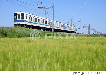 東武伊勢崎線ローカル電車が走る麦畑の風景
