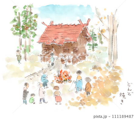 1月の行事、神社の前でお焚き上げをする風景(どんど焼き)の水彩画イラスト