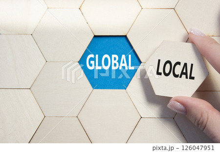 Global and Local symbol. Concept word Global and Local on wooden comb puzzle. Businessman hand. Beautiful blue background. Business and Global and Local concept. Copy space