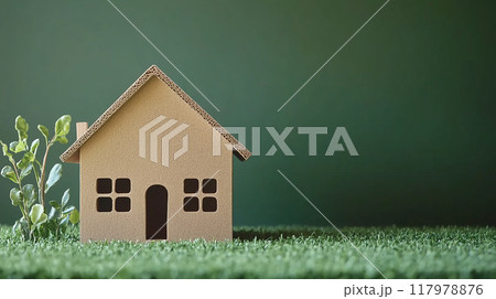 緑の背景と芝生の上にあるダンボールの家
