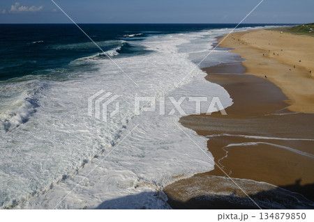 Coastline waves roll onto a golden beach with people enjoying a sunny day by the sea