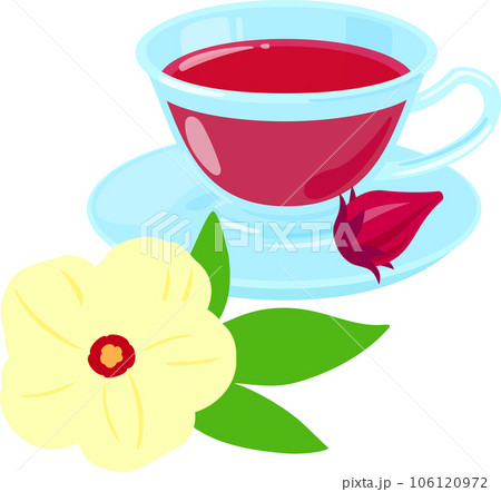 Realistic hibiscus tea. Roselle red flower hot drink cup, healthy flavor breakfast transparent glass mug with rose flowers bract heat cup pot