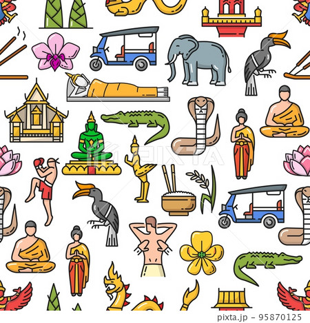 Thailand travel culture and religion seamless pattern, Thai landmarks on vector background. Thailand travel and tourism pattern of Buddha temple in Bangkok, food, massage and muay thai boxing