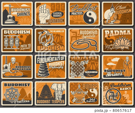Buddhism religion retro posters, buddhist symbols
