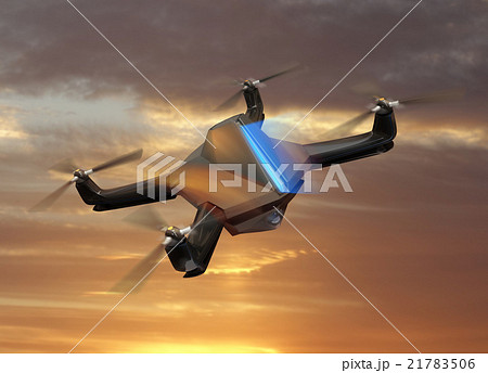 夕焼け中で飛翔するドローン