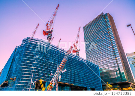 日本の東京都市景観新風景。TOKYO TORCH 常盤橋再開発 大手町に巨大鉄骨構造体やクレーン群